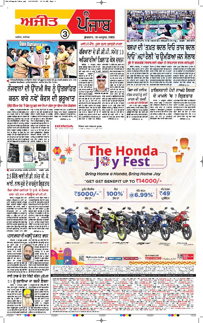 ਚੰਡੀਗੜ੍ਹ, 10 ਅਕਤੂਬਰ (ਅਜਾਇਬ ਔਜਲਾ)-15 ਅਕਤੂਬਰ ਨੂੰ ਸਮੁੱਚੇ ਦੇਸ਼ ਵਿਚ ਜ਼ਿਲ੍ਹਾ ਹੈੱਡ ਕੁਆਰਟਰਾਂ ਉਤੇ...
