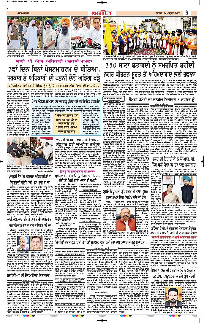 ਚੰਡੀਗੜ੍ਹ, 14 ਅਕਤੂਬਰ (ਰਾਮ ਸਿੰਘ ਬਰਾੜ)- ਹਰਿਆਣਾ ਦੇ ਏ.ਡੀ.ਜੀ.ਪੀ. ਪੀ.ਵਾਈ. ਪੂਰਨ ਕੁਮਾਰ ਖੁਦਕੁਸ਼ੀ ਮਾਮਲੇ ਦੇ ਦੋਸ਼ੀ ਹਰਿਆਣਾ ਦੇ ਡੀ.ਜੀ.ਪੀ. ਸ਼ਤਰੂਜੀਤ ਕਪੂਰ ਨੂੰ ਛੁੱਟੀ ’ਤੇ ਭੇਜ...