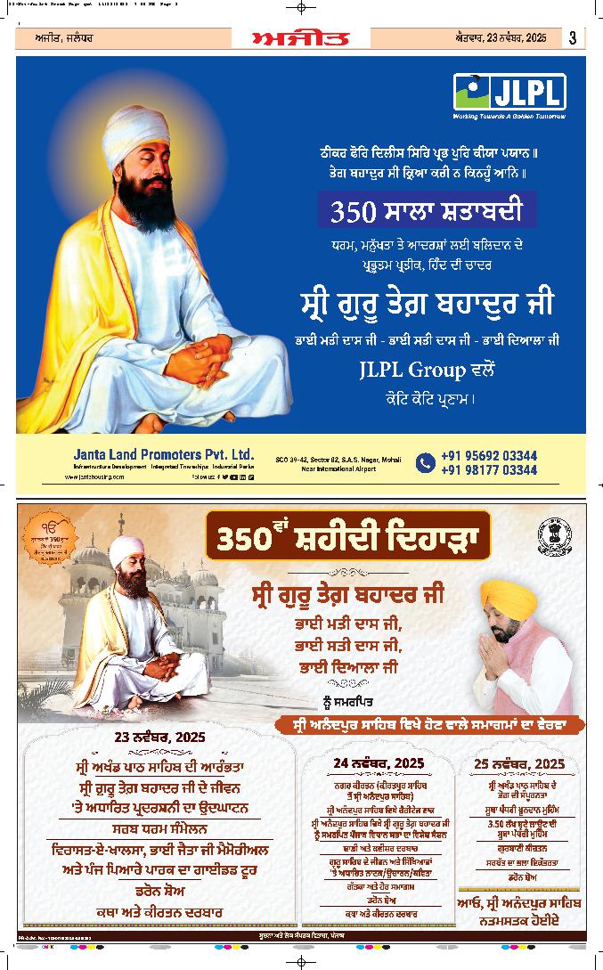 ਸ੍ਰੀ ਅਨੰਦਪੁਰ ਸਾਹਿਬ, 23 ਨਵੰਬਰ (ਜੇ.ਐਸ. ਨਿੱਕੂਵਾਲ)- ਹਿੰਦ ਦੀ ਚਾਦਰ ਸ੍ਰੀ ਗੁਰੂ ਤੇਗ਼ ਬਹਾਦਰ ਸਾਹਿਬ ਅਤੇ ਉਨ੍ਹਾਂ ਦੇ ਅਨਿਨ ਸੇਵਕ ਭਾਈ ਮਤੀ ਦਾਸ ਜੀ, ਭਾਈ ਸਤੀ ਦਾਸ ਜੀ ਅਤੇ ਭਾਈ ਦਿਆਲਾ...