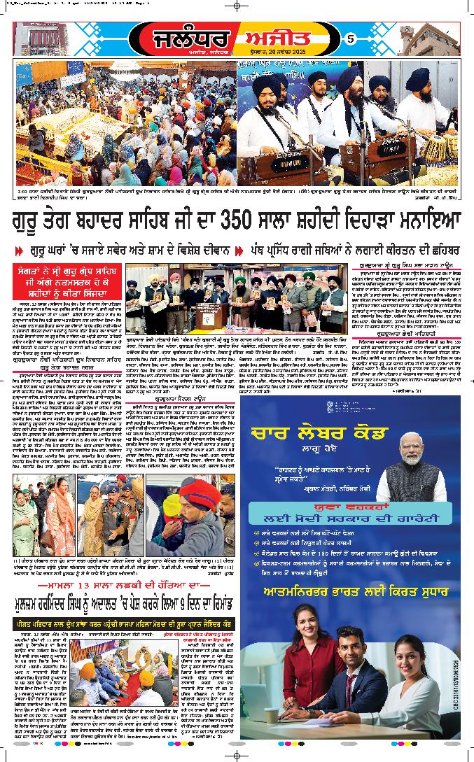 ਕਰਨਾਲ, 25 ਨਵੰਬਰ (ਗੁਰਮੀਤ ਸਿੰਘ ਸੱਗੂ)- ਪ੍ਰਧਾਨ ਮੰਤਰੀ ਨਰਿੰਦਰ ਮੋਦੀ ਨੇ ਅੱਜ ਕੁਰੂਕਸ਼ੇਤਰ 'ਚ ਸ੍ਰੀ ਗੁਰੂ ਤੇਗ ਬਹਾਦਰ ਜੀ ਦੇ 350ਵੇਂ ਸ਼ਹੀਦੀ ਦਿਵਸ ਸਮਾਰੋਹ ਨੂੰ ਸੰਬੋਧਨ ਕੀਤਾ...