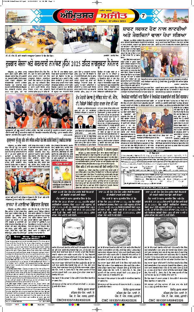 ਜਲੰਧਰ, 27 ਨਵੰਬਰ- ਸ੍ਰੀ ਅਕਾਲ ਤਖ਼ਤ ਸਾਹਿਬ ਦੇ ਕਾਰਜਕਾਰੀ ਜਥੇਦਾਰ ਅਤੇ ਤਖ਼ਤ ਸ੍ਰੀ ਕੇਸਗੜ੍ਹ ਸਾਹਿਬ ਦੇ ਜਥੇਦਾਰ ਸਿੰਘ ਸਾਹਿਬ ਗਿਆਨੀ ਕੁਲਦੀਪ ਸਿੰਘ ਗੜਗੱਜ ਨੇ ਅੱਜ ਬੀਤੇ ਦਿਨੀਂ ਜਲੰਧਰ...