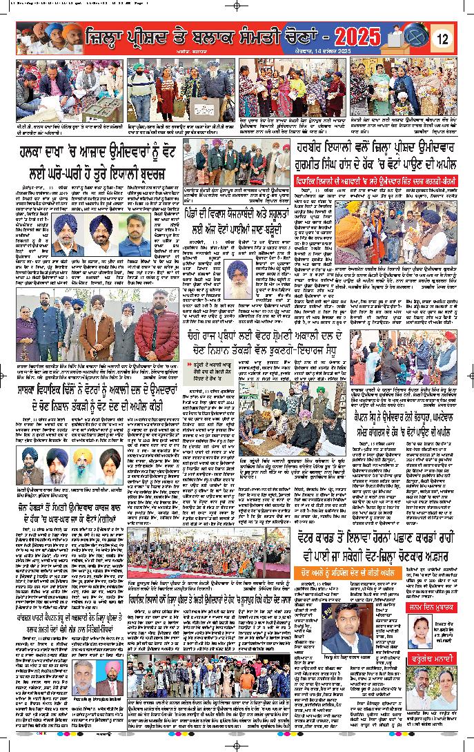 ਸ੍ਰੀ ਮੁਕਤਸਰ ਸਾਹਿਬ, 14 ਦਸੰਬਰ (ਰਣਜੀਤ ਸਿੰਘ ਢਿੱਲੋਂ)-ਜ਼ਿਲ੍ਹਾ ਚੋਣ ਅਫ਼ਸਰ-ਕਮ-ਡਿਪਟੀ ਕਮਿਸ਼ਨਰ ਅਭਿਜੀਤ ਕਪਲਿਸ਼ ਨੇ ਦੱਸਿਆ ਕਿ ਜ਼ਿਲ੍ਹਾ ਪ੍ਰੀਸ਼ਦ ਅਤੇ ਪੰਚਾਇਤ ਸੰਮਤੀ ਦੀਆਂ ਚੋਣਾਂ ਦੌਰਾਨ ...
