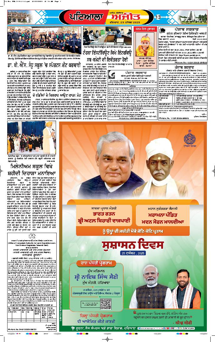 ਨਵੀਂ ਦਿੱਲੀ, 25 ਦਸੰਬਰ- ਅੱਜ ਸਾਬਕਾ ਪ੍ਰਧਾਨ ਮੰਤਰੀ ਅਟਲ ਬਿਹਾਰੀ ਵਾਜਪਾਈ ਦੀ 101ਵੀਂ ਜਨਮ ਵਰ੍ਹੇਗੰਢ ਹੈ। ਰਾਸ਼ਟਰਪਤੀ ਦਰੋਪਦੀ ਮੁਰਮੂ ਅਤੇ ਪ੍ਰਧਾਨ ਮੰਤਰੀ ਨਰਿੰਦਰ ਮੋਦੀ ਸਮੇਤ ਸਮੁੱਚਾ....