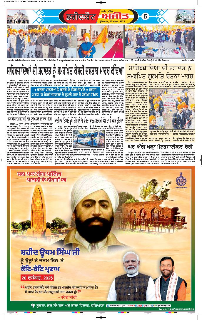 ਫ਼ਤਹਿਗੜ੍ਹ ਸਾਹਿਬ , 25 ਦਸੰਬਰ - ਹਰਿਆਣਾ ਦੇ ਮੁੱਖ ਮੰਤਰੀ ਨਾਇਬ ਸਿੰਘ ਸੈਣੀ ਅਤੇ ਭਾਰਤੀ ਜਨਤਾ ਪਾਰਟੀ (ਭਾਜਪਾ) ਪੰਜਾਬ ਦੇ ਕਾਰਜਕਾਰੀ ਪ੍ਰਧਾਨ ਅਸ਼ਵਨੀ ਸ਼ਰਮਾ ਸਾਹਿਬਜ਼ਾਦਿਆਂ ਦੇ ਸ਼ਹੀਦੀ ਅਸਥਾਨ ਗੁਰਦੁਆਰਾ...