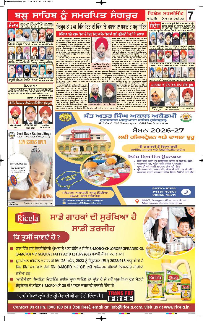 ਸੁਲਤਾਨਪੁਰ ਲੋਧੀ,15 ਜਨਵਰੀ (ਥਿੰਦ) - ਨੈਸ਼ਨਲ ਹਾਈਵੇ ਅਥਾਰਟੀ ਵਲੋਂ ਹਲਕਾ ਸੁਲਤਾਨਪੁਰ ਲੋਧੀ ਅੰਦਰ ਕਿਸਾਨਾਂ ਦੀਆਂ ਸੈਂਕੜੇ ਏਕੜ ਜ਼ਮੀਨਾਂ ਐਕਸਪ੍ਰੈਸ ਵੇਅ ਲਈ ਐਕਵਾਇਰ ਕਰਕੇ ਉਨ੍ਹਾਂ ਨੂੰ ਯੋਗ ...
