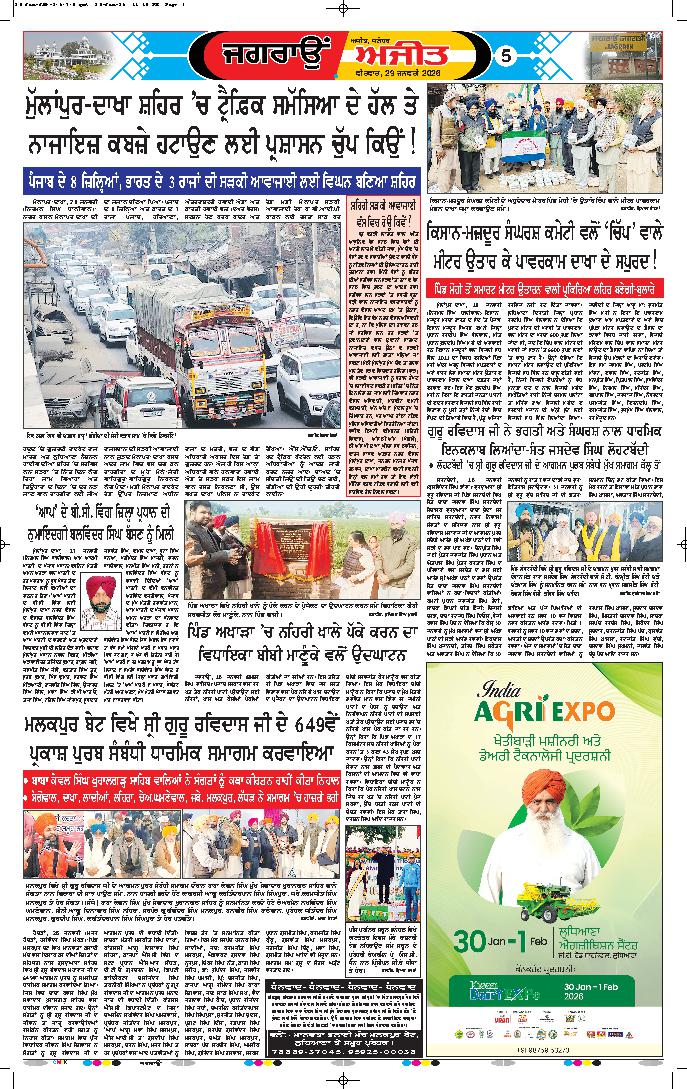 ਜਲੰਧਰ, 29 ਜਨਵਰੀ- ਸ੍ਰੀ ਗੁਰੂ ਰਵਿਦਾਸ ਜੀ ਦੇ ਪ੍ਰਕਾਸ਼ ਪੁਰਬ ਦੇ ਸੰਬੰਧ ’ਚ 31 ਜਨਵਰੀ 2026 ਨੂੰ ਜ਼ਿਲ੍ਹਾ ਜਲੰਧਰ ’ਚ ਕੱਢੀ ਜਾਣ ਵਾਲੀ ਵਿਸ਼ਾਲ ਸ਼ੋਭਾ ਯਾਤਰਾ ਦੇ ਮੱਦੇਨਜ਼ਰ ਡੀ.ਸੀ....