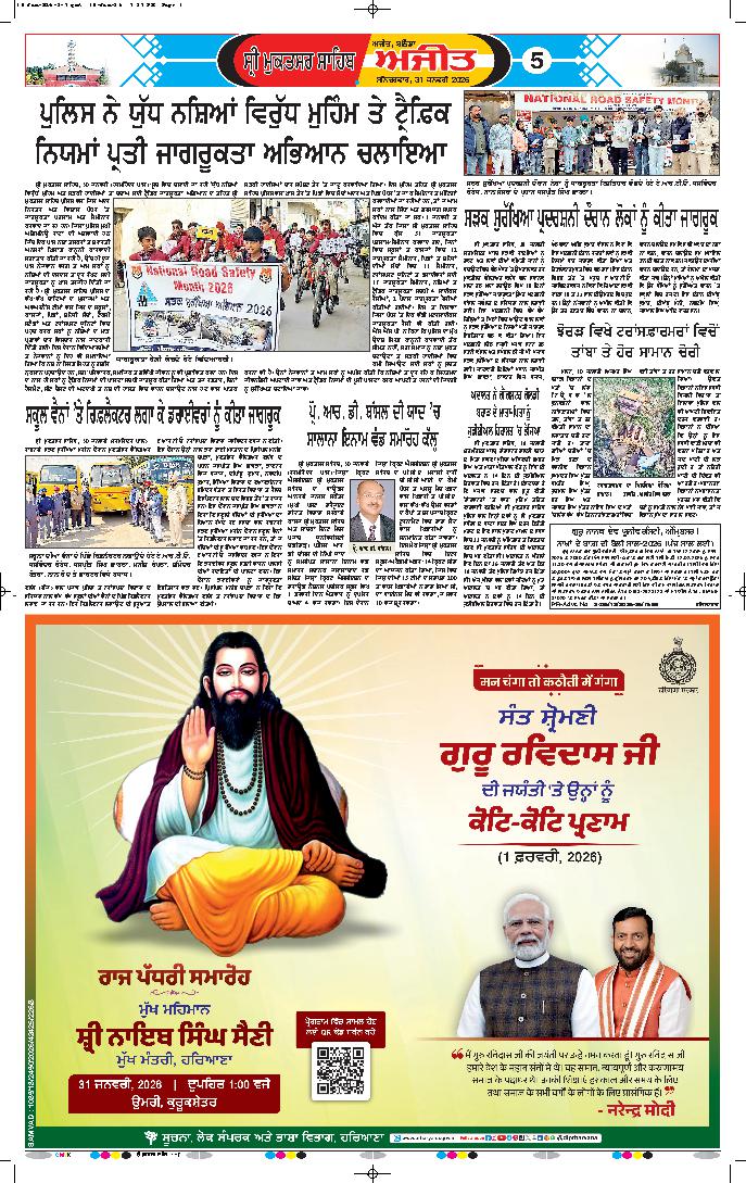 ਫਗਵਾੜਾ, 30 ਜਨਵਰੀ (ਅਸ਼ੋਕ ਕੁਮਾਰ ਵਾਲੀਆ)- ਸ੍ਰੀ ਗੁਰੂ ਰਵਿਦਾਸ ਮਹਾਰਾਜ ਜੀ ਦੇ ਪ੍ਰਕਾਸ਼ ਉਤਸਵ ਦੇ ਸੰਬੰਧ ਵਿਚ 31 ਜਨਵਰੀ 2026 ਨੂੂੰ ਸਬ ਡਵੀਜ਼ਨ ਫਗਵਾੜਾ ਵਿਚ ਵਿਸ਼ਾਲ ਸ਼ੋਭਾ....
