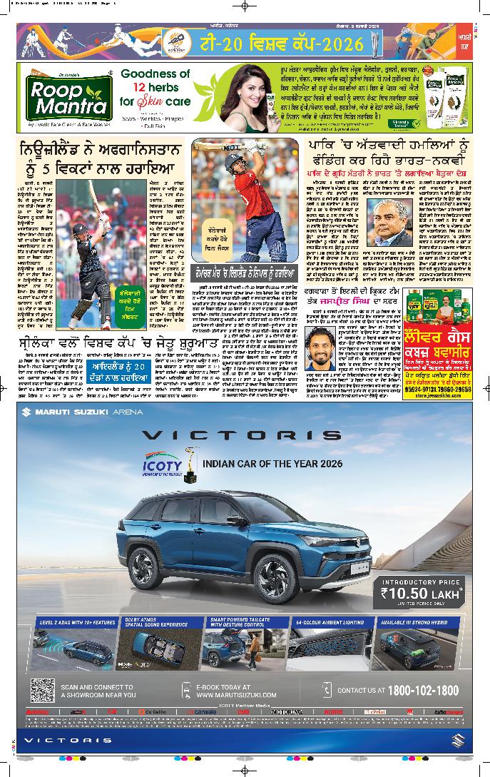 ਕੋਲੰਬੋ,8 ਫਰਵਰੀ - ਟੀ-20 ਵਿਸ਼ਵ ਕੱਪ 2026 ਦਾ ਛੇਵਾਂ ਮੈਚ ਕੋਲੰਬੋ ਵਿਚ ਸ਼੍ਰੀਲੰਕਾ ਅਤੇ ਆਇਰਲੈਂਡ ਵਿਚਕਾਰ ਖੇਡਿਆ ਗਿਆ, ਦੋਵੇਂ ਗਰੁੱਪ ਬੀ ਟੀਮਾਂ। ਸ਼੍ਰੀਲੰਕਾ ਨੇ ਆਇਰਲੈਂਡ ਨੂੰ 20 ਦੌੜਾਂ ਨਾਲ ਹਰਾ ਕੇ ਗਲੋਬਲ ਟੂਰਨਾਮੈਂਟ ਵਿਚ ਆਪਣੀ ...