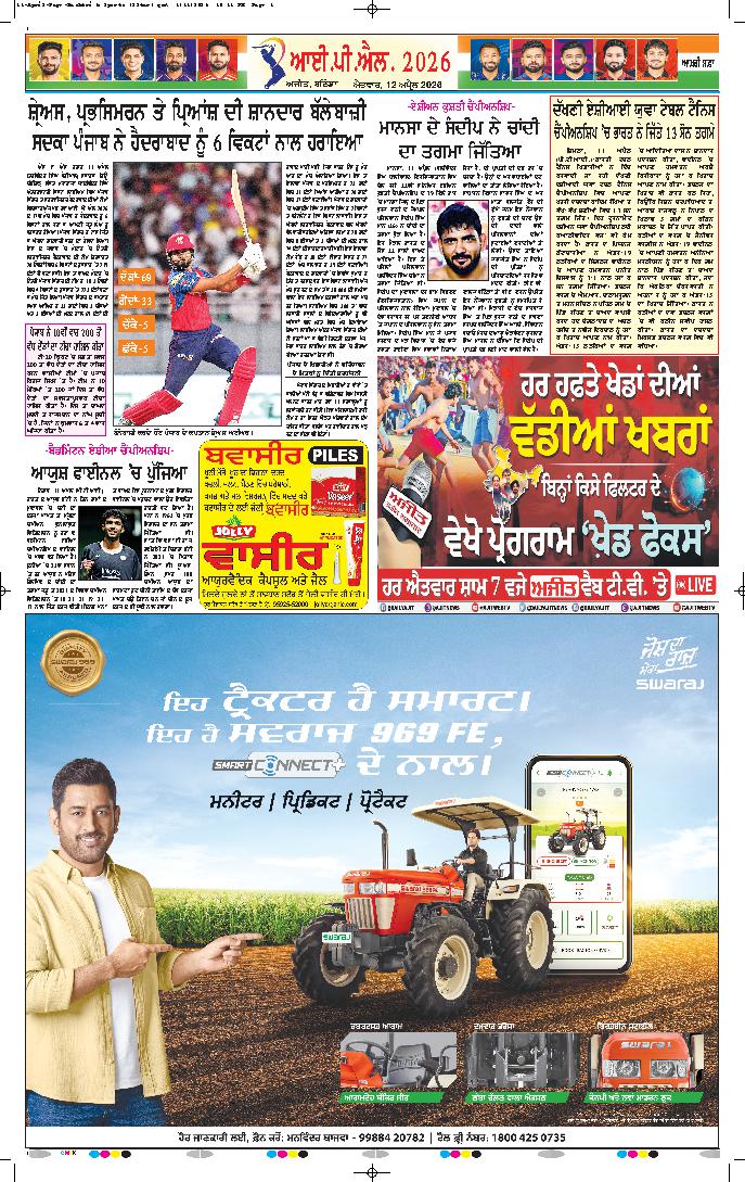 ਸੰਜੂ ਨੇ ਲਗਾਇਆ ਇਸ ਸੀਜ਼ਨ ਦਾ ਪਹਿਲਾ ਸੈਂਕੜਾ ਚੇਨਈ, 11 ਅਪ੍ਰੈਲ (ਏਜੰਸੀ)-ਇੰਡੀਅਨ ਪ੍ਰੀਮੀਅਰ ਲੀਗ (ਆਈ.ਪੀ.ਐਲ. 2026) ਦੇ 18ਵਾਂ ਮੈਚ 'ਚ ਚੇਨਈ ਸੁਪਰ ਕਿੰਗਜ਼ (ਸੀ.ਐਸ.ਕੇ.) ਨੇ ਦਿੱਲੀ ਕੈਪੀਟਲਜ਼ ਨੂੰ 23 ਦੌੜਾਂ ਨਾਲ ਹਰਾਇਆ | ਚੇਨਈ ਦੇ ਐਮ.ਏ. ਚਿਦੰਬਰਮ ਸਟੇਡੀਅਮ 'ਚ ਖੇਡੇ ਗਏ ਇਸ ਮੈਚ 'ਚ ਦਿੱਲੀ ਨੇ ਟਾਸ ਜਿੱਤ ਕੇ ਪਹਿਲਾਂ ਗੇਂਦਬਾਜ਼ੀ ਕਰਨ ਦਾ ਫ਼ੈਸਲਾ ਕੀਤਾ | ਸੀ.ਐਸ.ਕੇ ਲਈ ਬੱਲੇਬਾਜ਼ੀ ਕਰਦੇ ਹੋਏ ਸੰਜੂ ਸੈਮਸਨ ਨੇ ਸਿਰਫ਼ 52 ਗੇਂਦਾਂ 'ਚ ਸੈਂਕੜਾ ਲਗਾਇਆ ਤੇ...
