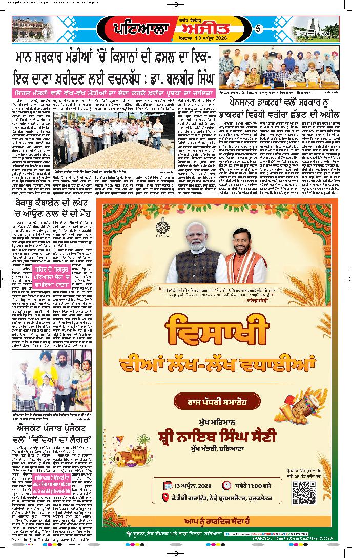ਚੰਡੀਗੜ੍ਹ,13 ਅਪ੍ਰੈਲ -ਮੁੱਖ ਮੰਤਰੀ ਭਗਵੰਤ ਨੇ ਕਿਹਾ ਕਿ ਅੱਜ ਇਕ ਇਤਿਹਾਸਕ ਦਿਨ ਹੈ। ਇਸ ਨੂੰ ਖਾਲਸਾ ਸਿਰਜਣਾ ਦਿਵਸ ਵੀ ਕਿਹਾ ਜਾਂਦਾ ਹੈ। ਸ੍ਰੀ ਗੁਰੂ ਗ੍ਰੰਥ ਸਾਹਿਬ ਨੂੰ ਜੀਵੰਤ ਗੁਰੂ ਦਾ...
