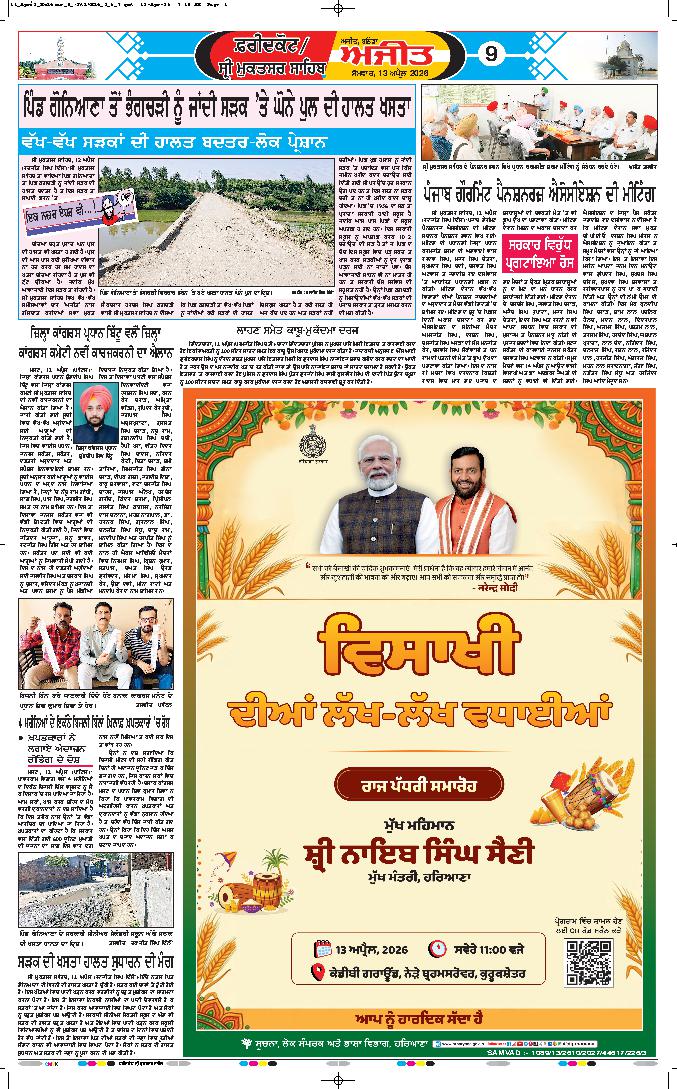 ਚੰਡੀਗੜ੍ਹ,13 ਅਪ੍ਰੈਲ -ਮੁੱਖ ਮੰਤਰੀ ਭਗਵੰਤ ਨੇ ਕਿਹਾ ਕਿ ਅੱਜ ਇਕ ਇਤਿਹਾਸਕ ਦਿਨ ਹੈ। ਇਸ ਨੂੰ ਖਾਲਸਾ ਸਿਰਜਣਾ ਦਿਵਸ ਵੀ ਕਿਹਾ ਜਾਂਦਾ ਹੈ। ਸ੍ਰੀ ਗੁਰੂ ਗ੍ਰੰਥ ਸਾਹਿਬ ਨੂੰ ਜੀਵੰਤ ਗੁਰੂ ਦਾ...