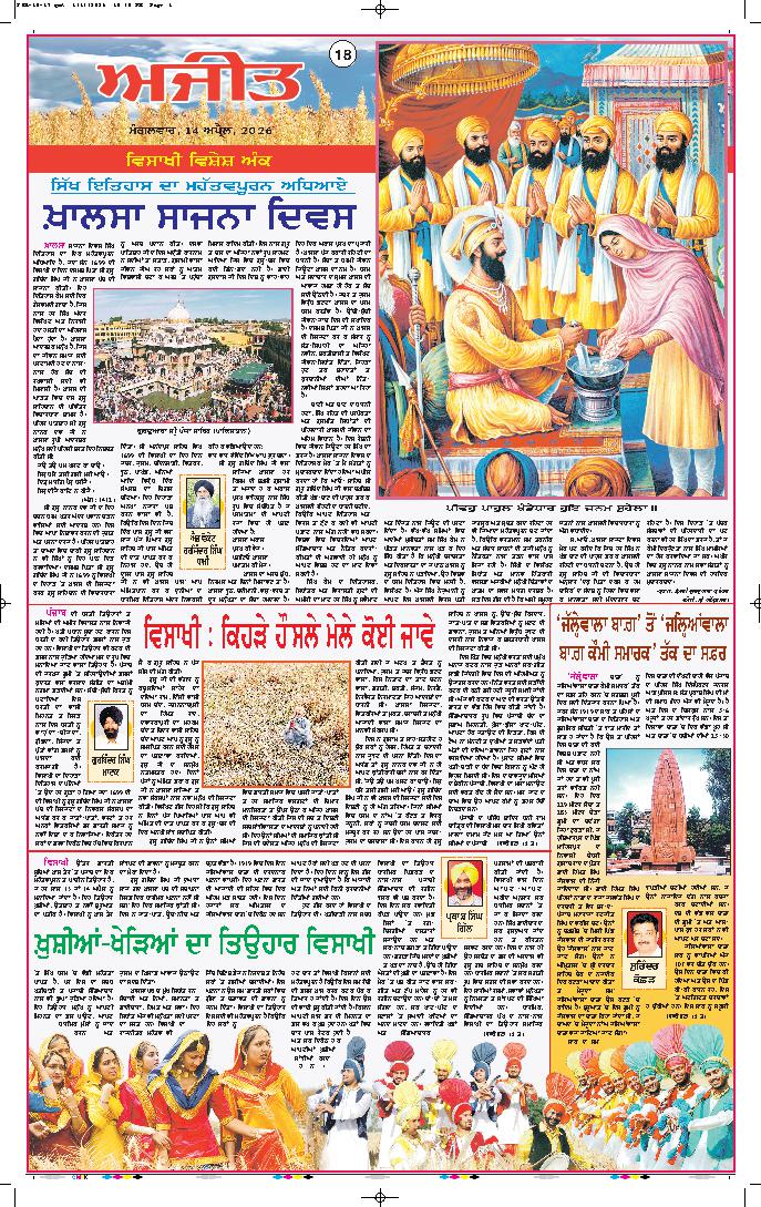 ਅੰਮ੍ਰਿਤਸਰ, 14 ਅਪ੍ਰੈਲ - ਅੱਜ ਖ਼ਾਲਸਾ ਪੰਥ ਦਾ ਸਾਜਨਾ ਦਿਵਸ ਸ਼ਰਧਾ ਤੇ ਉਤਸ਼ਾਹ ਨਾਲ ਮਨਾਇਆ ਜਾ ਰਿਹਾ ਹੈ। ਅੱਜ ਸੱਚਖੰਡ ਸ੍ਰੀ ਹਰਿਮੰਦਰ ਸਾਹਿਬ ਵਿਚ ਵੀ ਸਵੇਰ ਤੋਂ ਹੀ ਸ਼ਰਧਾਲੂ ਨਤਮਸਤਕ ਹੋ ਕੇ ਗੁਰੂ ਘਰ ਆਪਣੀ...