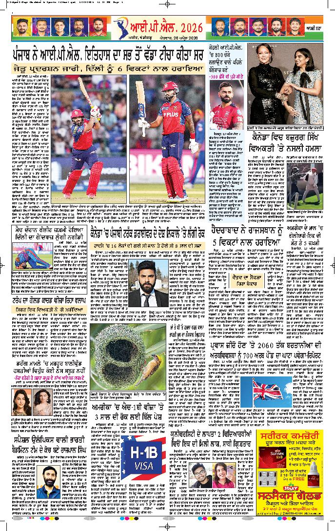 ਜੈਪੁਰ, 25 ਅਪ੍ਰੈਲ - ਆਈ.ਪੀ.ਐੱਲ. 2026 ਦਾ 36ਵਾਂ ਮੈਚ ਰਾਜਸਥਾਨ ਰਾਇਲਜ਼ ਅਤੇ ਸਨਰਾਈਜ਼ਰਸ ਹੈਦਰਾਬਾਦ ਵਿਚਕਾਰ ਸਵਾਈ ਮਾਨਸਿੰਘ ਸਟੇਡੀਅਮ ਜੈਪੁਰ ਵਿਖੇ ਖੇਡਿਆ ਗਿਆ। ਟਾਸ ਜਿੱਤ ਕੇ ਹੈਦਰਾਬਾਦ...