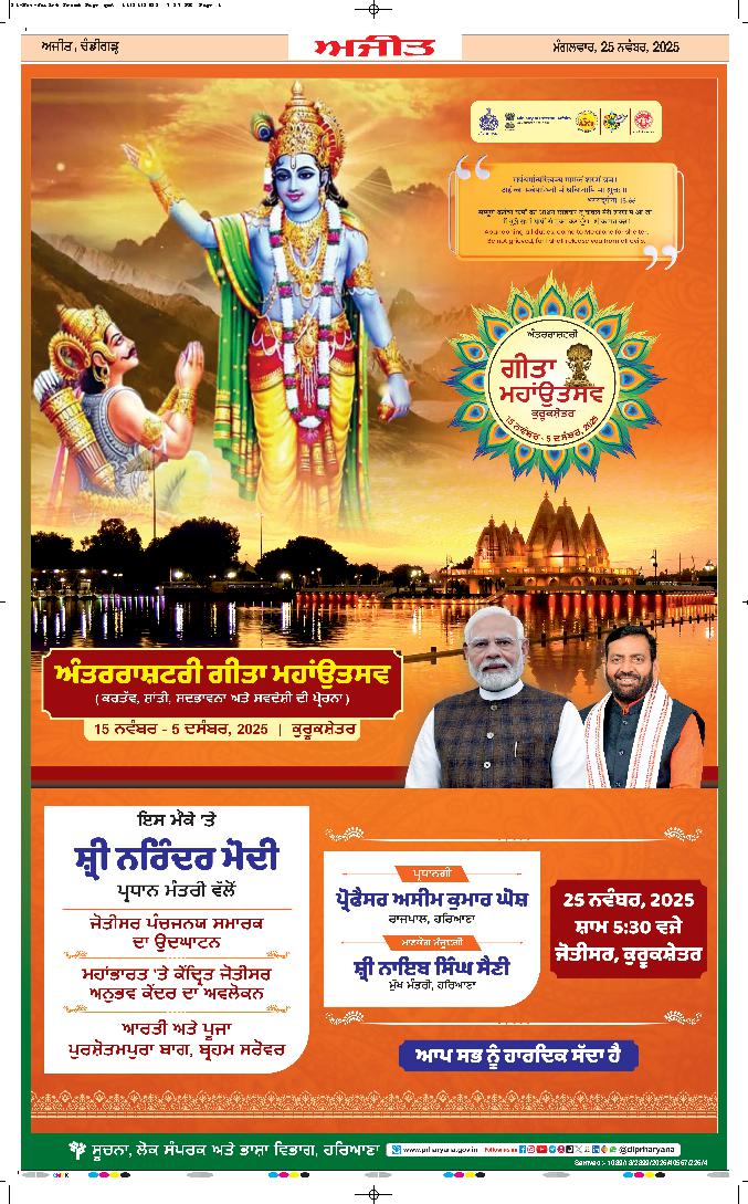 ਹਰਿਆਣਾ, 25 ਨਵੰਬਰ- ਪ੍ਰਧਾਨ ਮੰਤਰੀ ਨਰਿੰਦਰ ਮੋਦੀ ਅੱਜ ਹਰਿਆਣਾ ਦੇ ਕੁਰੂਕਸ਼ੇਤਰ ਵਿਖੇ ਪੁੱਜੇ, ਜਿਥੇ ਉਹ ਨੌਵੇਂ ਸਿੱਖ ਗੁਰੂ, ਸ੍ਰੀ ਗੁਰੂ ਤੇਗ ਬਹਾਦਰ ਜੀ ਦੇ 350ਵੇਂ ਸ਼ਹੀਦੀ ਦਿਵਸ ਦੀ ਯਾਦ...