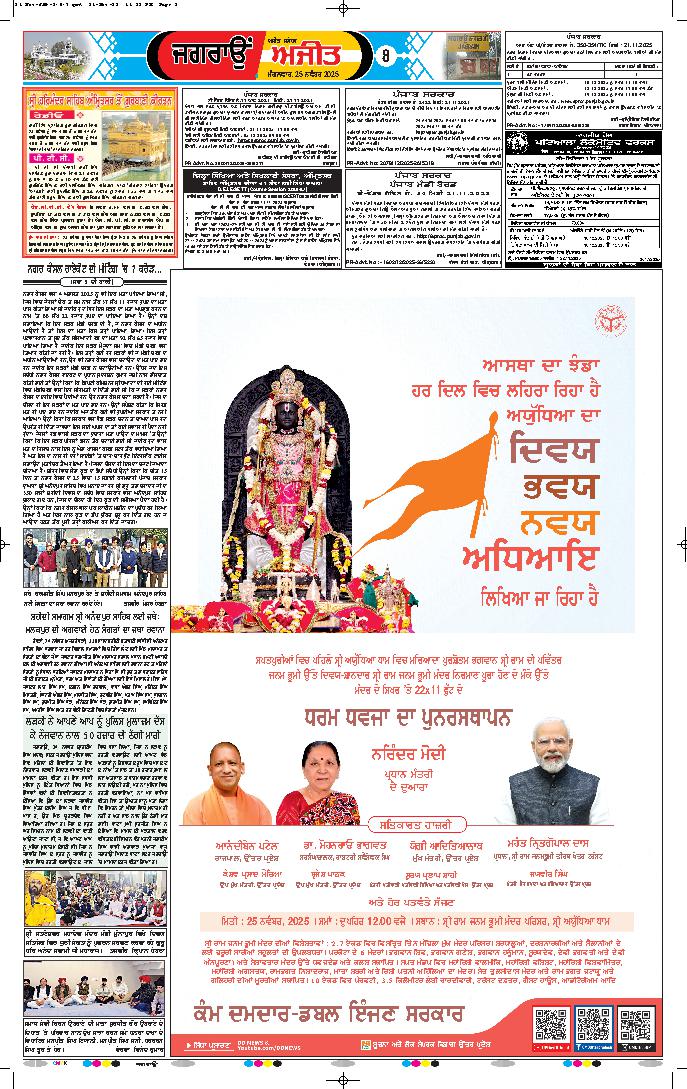 ਅਯੋਧਿਆ (ਯੂ.ਪੀ.), 25 ਨਵੰਬਰ - ਅੱਜ ਇਤਿਹਾਸਕ ਝੰਡਾ ਲਹਿਰਾਉਣ ਦੀ ਰਸਮ ਤੋਂ ਪਹਿਲਾਂ ਸ਼੍ਰੀ ਰਾਮ ਸ਼ਹਿਰ ਨੂੰ ਸਖ਼ਤ ਸੁਰੱਖਿਆ ਦੇ ਵਿਚਕਾਰ ਬਹੁਤ ਹੀ ਸੁੰਦਰ ਢੰਗ ਨਾਲ ਸਜਾਇਆ...