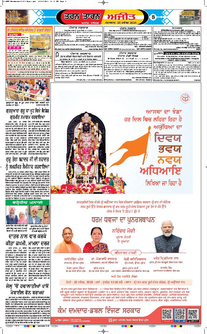 ਅਯੋਧਿਆ (ਯੂ.ਪੀ.), 25 ਨਵੰਬਰ - ਅੱਜ ਇਤਿਹਾਸਕ ਝੰਡਾ ਲਹਿਰਾਉਣ ਦੀ ਰਸਮ ਤੋਂ ਪਹਿਲਾਂ ਸ਼੍ਰੀ ਰਾਮ ਸ਼ਹਿਰ ਨੂੰ ਸਖ਼ਤ ਸੁਰੱਖਿਆ ਦੇ ਵਿਚਕਾਰ ਬਹੁਤ ਹੀ ਸੁੰਦਰ ਢੰਗ ਨਾਲ ਸਜਾਇਆ...