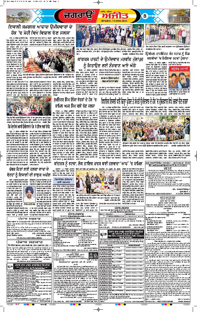 ਜਲੰਧਰ, 14 ਦਸੰਬਰ- ਚੋਣਾਂ ਦੇ ਸੁਚਾਰੂ, ਆਜ਼ਾਦ, ਨਿਰਪੱਖ ਅਤੇ ਪਾਰਦਰਸ਼ੀ ਸੰਚਾਲਨ ਤੋਂ ਬਾਅਦ, ਜ਼ਿਲ੍ਹਾ ਪ੍ਰਸ਼ਾਸਨ ਜਲੰਧਰ ਵਲੋਂ ਕੀਤੇ ਗਏ ਵਿਸਤ੍ਰਿਤ ਪ੍ਰਬੰਧਾਂ ਵਿਚਕਾਰ ਹੋਈਆਂ ਜ਼ਿਲ੍ਹਾ ਪ੍ਰੀਸ਼ਦ ਅਤੇ ਪੰਚਾਇਤ ...