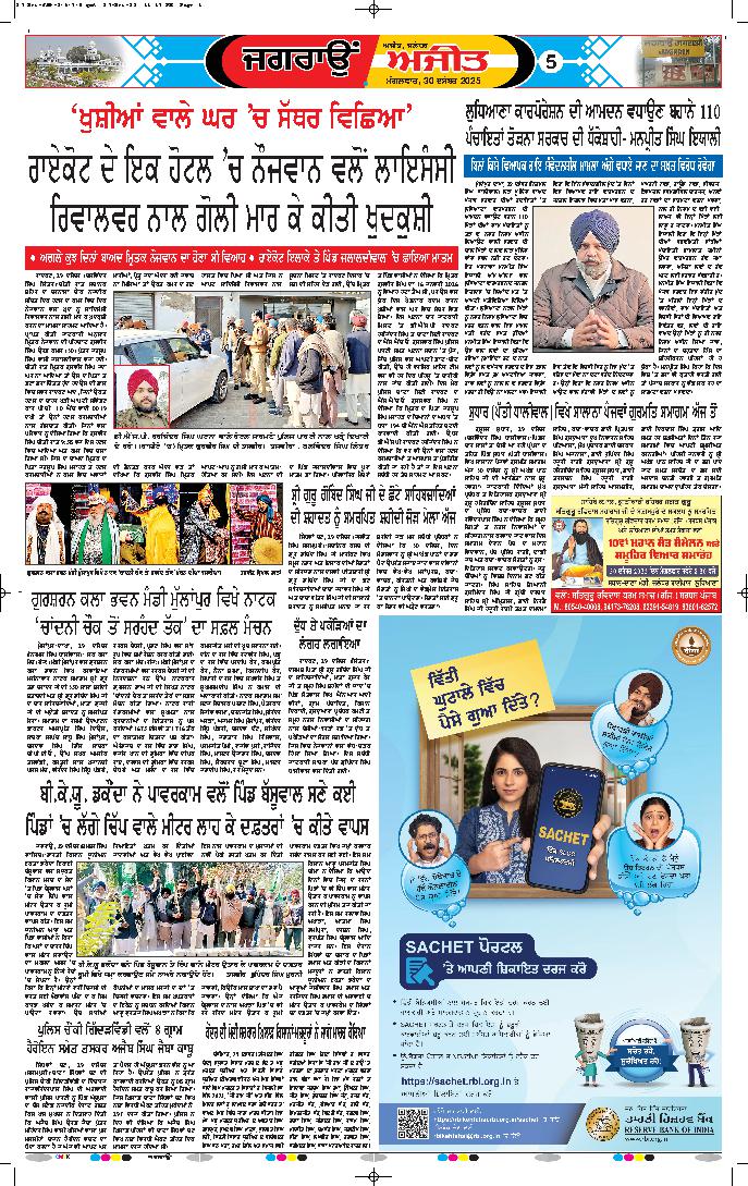 ਜਲੰਧਰ, 29 ਦਸੰਬਰ - ਜਲੰਧਰ ਪੱਛਮੀ ਬਚਾਓ ਮੋਰਚਾ ਦੀ ਅਗਵਾਈ ਹੇਠ, 120 ਫੁੱਟ ਰੋਡ 'ਤੇ ਬਾਬੂ ਜਗਜੀਵਨ ਰਾਮ ਚੌਕ ਵਿਖੇ ਲੋਕਾਂ ਨੇ ਪੁਲਿਸ ਦੇ ਕੰਮਕਾਜ ਪ੍ਰਤੀ ਆਪਣੀ ਨਾਰਾਜ਼ਗੀ ਪ੍ਰਗਟ ਕੀਤੀ ਅਤੇ ਪੱਛਮੀ ...