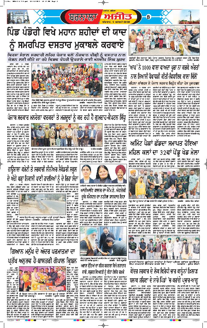 ਮਹਿਲ ਕਲਾਂ,31 ਦਸੰਬਰ (ਅਵਤਾਰ ਸਿੰਘ ਅਣਖੀ)-ਧੰਨ ਧੰਨ ਮਾਤਾ ਗੁਜਰ ਕੌਰ ਜੀ, ਚਾਰੇ ਸਾਹਿਬਜ਼ਾਦਿਆਂ ਦੀ ਲਾਸਾਨੀ ਸ਼ਹਾਦਤ ਨੂੰ ਸਮਰਪਿਤ ਅਤੇ ਬਾਬਾ ਗੱਜਣ ਸ਼ਾਹ ਦੀ ਯਾਦ 'ਚ ਪਿੰਡ ਪੰਡੋਰੀ (ਬਰਨਾਲਾ) ਵਿਖੇ ਬੱਚਿਆਂ ...