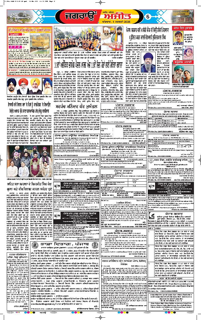 ਅੰਮ੍ਰਿਤਸਰ, 1 ਜਨਵਰੀ (ਜਸਵੰਤ ਸਿੰਘ ਜੱਸ)- ਨਵੇਂ ਸਾਲ 2026 ਦੀ ਆਮਦ ’ਤੇ ਦੇਸ਼ ਵਿਦੇਸ਼ ਤੋਂ ਲੱਖਾਂ ਦੀ ਗਿਣਤੀ ਵਿਚ ਸੰਗਤਾਂ ਸ੍ਰੀ ਹਰਿਮੰਦਰ ਸਾਹਿਬ ਵਿਖੇ ਨਤਮਸਤਕ ਹੋਣ ਪੁੱਜੀਆਂ ਅਤੇ ਨਵੇਂ....