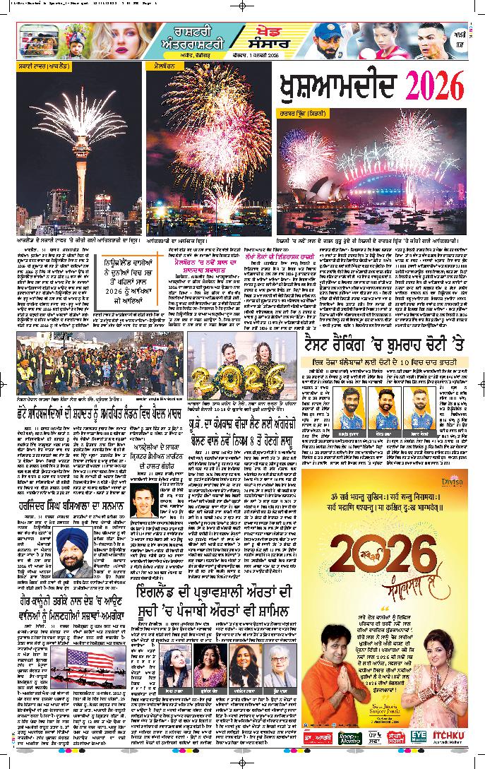 ਅੰਮ੍ਰਿਤਸਰ, 1 ਜਨਵਰੀ (ਜਸਵੰਤ ਸਿੰਘ ਜੱਸ)- ਨਵੇਂ ਸਾਲ 2026 ਦੀ ਆਮਦ ’ਤੇ ਦੇਸ਼ ਵਿਦੇਸ਼ ਤੋਂ ਲੱਖਾਂ ਦੀ ਗਿਣਤੀ ਵਿਚ ਸੰਗਤਾਂ ਸ੍ਰੀ ਹਰਿਮੰਦਰ ਸਾਹਿਬ ਵਿਖੇ ਨਤਮਸਤਕ ਹੋਣ ਪੁੱਜੀਆਂ ਅਤੇ ਨਵੇਂ....
