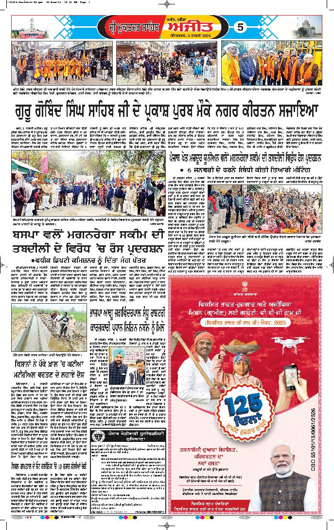 ਜਲੰਧਰ , 2 ਜਨਵਰੀ - ਭਾਜਪਾ ਦੇ ਸੂਬਾਈ ਉਪ ਪ੍ਰਧਾਨ ਰਾਜੇਸ਼ ਬਾਘਾ ਨੇ ਜਲੰਧਰ ਦੇ ਪ੍ਰੈੱਸ ਕਲੱਬ ਵਿਖੇ ਮਨਰੇਗਾ ਦੇ ਮਹੱਤਵਪੂਰਨ ਵਿਸ਼ੇ 'ਤੇ ਪ੍ਰੈੱਸ ਕਾਨਫਰੰਸ ਨੂੰ ਸੰਬੋਧਨ ਕਰਦਿਆਂ ਕਿਹਾ ਕਿ ਵਿਕਾਸ ਭਾਰਤ ਰੁਜ਼ਗਾਰ ਏਵਮ ...