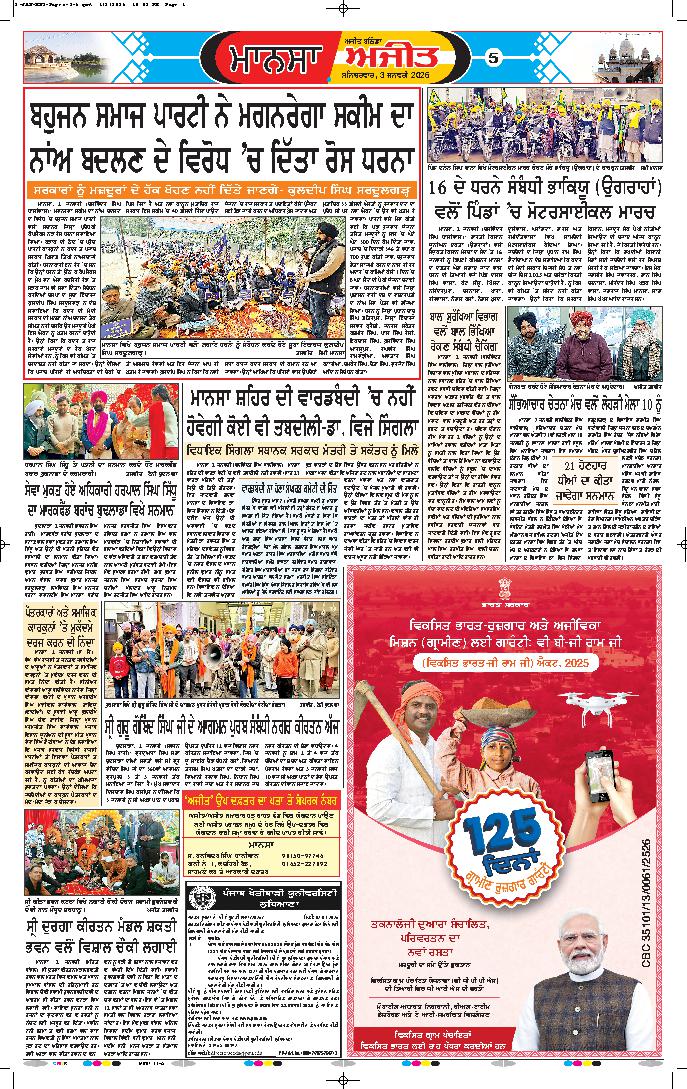 ਜਲੰਧਰ , 2 ਜਨਵਰੀ - ਭਾਜਪਾ ਦੇ ਸੂਬਾਈ ਉਪ ਪ੍ਰਧਾਨ ਰਾਜੇਸ਼ ਬਾਘਾ ਨੇ ਜਲੰਧਰ ਦੇ ਪ੍ਰੈੱਸ ਕਲੱਬ ਵਿਖੇ ਮਨਰੇਗਾ ਦੇ ਮਹੱਤਵਪੂਰਨ ਵਿਸ਼ੇ 'ਤੇ ਪ੍ਰੈੱਸ ਕਾਨਫਰੰਸ ਨੂੰ ਸੰਬੋਧਨ ਕਰਦਿਆਂ ਕਿਹਾ ਕਿ ਵਿਕਾਸ ਭਾਰਤ ਰੁਜ਼ਗਾਰ ਏਵਮ ...