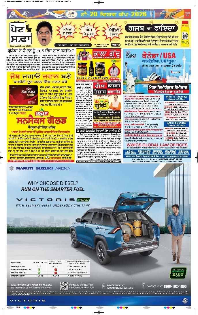 ਚੰਡੀਗੜ੍ਹ, 13 ਫਰਵਰੀ- ਭਾਰਤੀ ਕ੍ਰਿਕਟ ਟੀਮ ਦੀ ਸ਼ਾਨਦਾਰ ਜਿੱਤ ’ਤੇ ਮੁੱਖ ਮੰਤਰੀ ਪੰਜਾਬ ਭਗਵੰਤ ਮਾਨ ਨੇ ਟੀਮ ਨੂੰ ਵਧਾਈ ਦਿੱਤੀ ਹੈ। ਉਨ੍ਹਾਂ ਟਵੀਟ ਕਰ ਕਿਹਾ ਕਿ ਟੀ-20 ਵਿਸ਼ਵ ਕੱਪ 2026 ਦੇ....