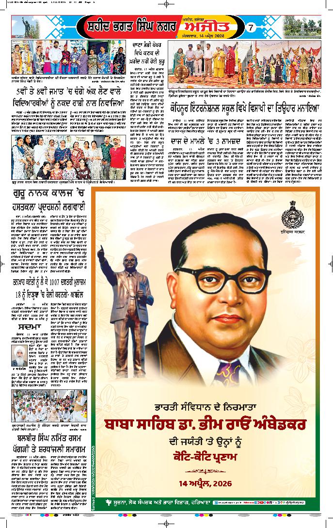 ਚੰਡੀਗੜ੍ਹ, 14 ਅਪ੍ਰੈਲ - ਭਾਰਤੀ ਸੰਵਿਧਾਨ ਦੇ ਨਿਰਮਾਤਾ ਡਾ. ਬੀ.ਆਰ. ਅੰਬੇਡਕਰ ਦਾ ਜਨਮ ਦਿਵਸ ਅੱਜ ਮਨਾਇਆ ਜਾ ਰਿਹਾ ਹੈ। ਇਸ ਨੂੰ ਲੈ ਕੇ ਆਦਮਪੁਰ ਨੇੜੇ ਪਿੰਡ ਉਦੇਸੀਆਂ ਵਿਖੇ ਪੰਜਾਬ ਸਰਕਾਰ ਵਲੋਂ ਸੂਬਾ ਪੱਧਰੀ...